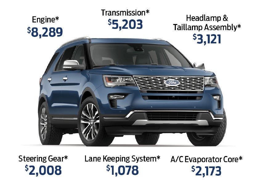 These examples are based on an average estimated U.S. retail repair cost for a Ford Explorer. Actual repair costs will vary by vehicle and dealer location. Covered components are based on a Ford Protect PremiumCARE plan.