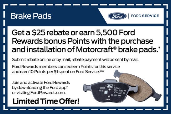 Get a $25 rebate or earn 5,500 Ford Rewards bonus Points with the purchase and installation of Motorcraft® brake pads.*